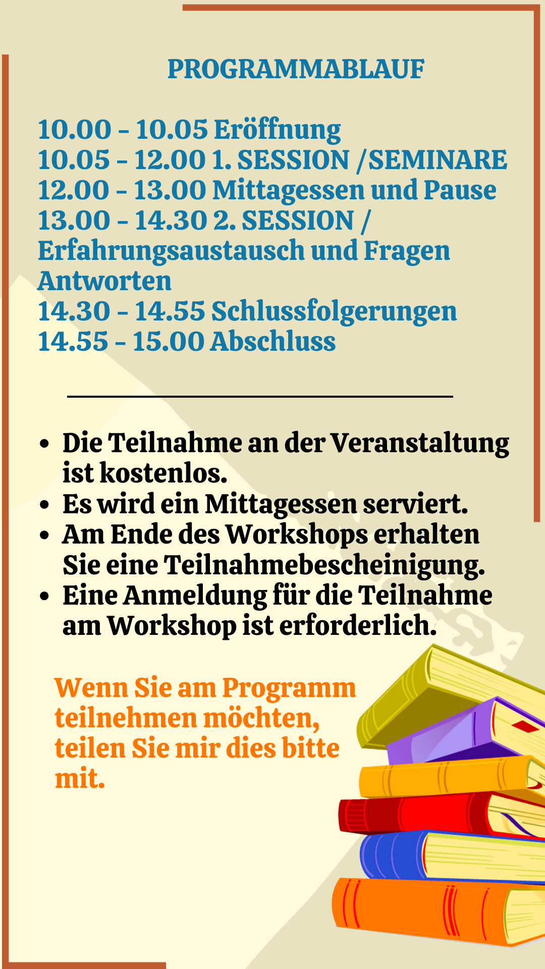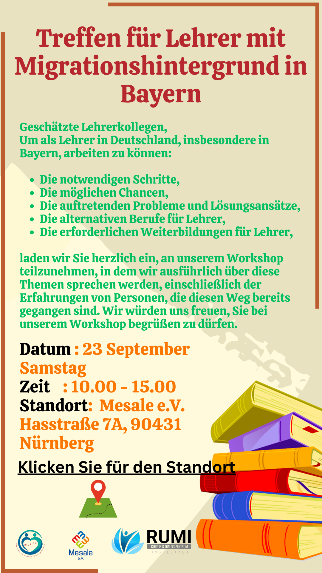 23 Eylül 2023 tarihinde, Nürnberg Mesale Eğitim Enstitüsü konferans salonunda “Almanya/Bavyera’da Yabancı Eğitmenler için Kariyer Fırsatları” başlıklı bir günlük bir çalıştay düzenlendi. Bu çalıştaya, Bavyera eyaletinde yaşayan 72 Türk kökenli eğitmen katıldı ve büyük bir başarı elde edildi.